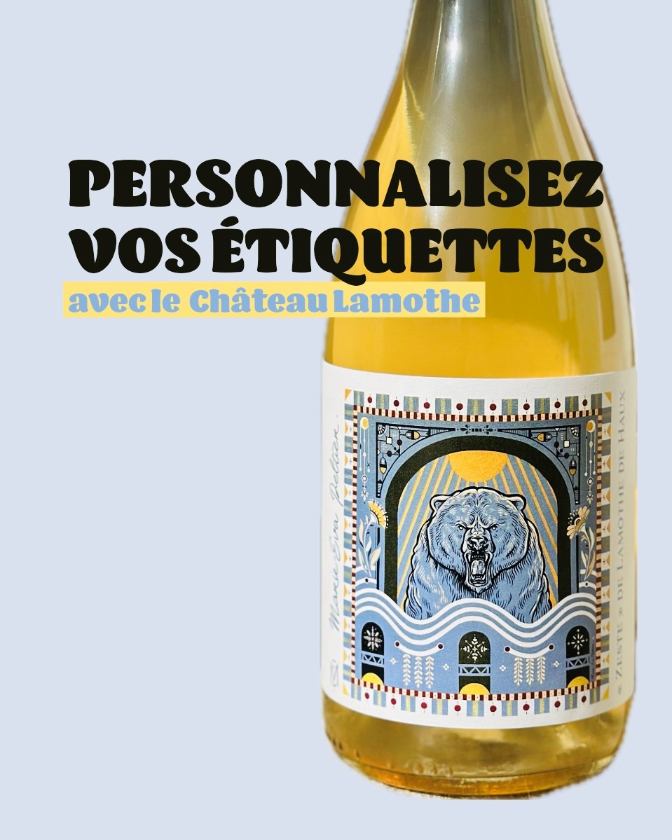 Vous cherchez une façon originale de marquer un événement spécial ? Avec Imprimothe, Valentine, diplômée d’une école de design, vous propose un service de personnalisation d’étiquettes sur nos vins. Que ce soit pour un mariage, un anniversaire, une fête d’entreprise ou toute autre occasion, que vous soyez professionnel ou particulier, donnez une touche personnelle à vos bouteilles ! Choisissez parmi notre sélection de vins élaborés au Château Lamothe de Haux, puis créez votre propre étiquette. Vous pouvez soit nous fournir directement votre visuel ou alors faire appel à Valentine qui vous accompagnera dans la création. Le plus ? Aucun minimum de commande n’est requis : Nous nous adaptons à vos besoins. Imprimothe, c’est notre vin, votre étiquette, votre style !